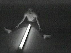 This videotape records the activities Nauman performed four years earlier in 1965. Both in this performance and in this work he strikes and holds a variety of poses on the floor in relation to a glowing fluorescent light fixture.