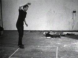 In this film Nauman bounces two balls in the center of a square marked by tape on the studio floor. He throws them as hard as he can, trying to maintain a specific pattern, but the balls ricochet out of control as his moves become correspondingly jumpy and unpredictable. The film was shot with a stationary camera in the studio that Nauman sublet from William T. Wiley in Mill Valley, California. The sound and image are out of sync because he "didn't have the equipment and patience" to coordinate them.