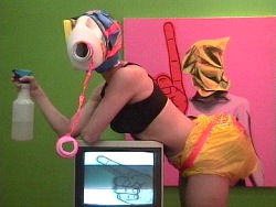 In Lieder, Donegan sets up a series of charged relationships -- between artist and model, art object and artistic "gesture," performer and viewer. Donegan is rendered anonymous in an absurdist mask, her head wrapped in plastic bottles and duct-tape, her pregnant body swathed in a black garbage bag.
