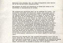 In 1970, seeking to support projects in the emergent electronic arts movement, Howard Wise closed his New York gallery to found the nonprofit organization Electronic Arts Intermix (EAI). EAI was incorporated on August 17, 1971 to "explore the potentials of the electronic media as a means of expression and non-commercial communication." EAI's founding mission was to advance and support experimentation in electronic art by providing artists with access to funding, technology, information, and resources, as well as to promote public understanding and awareness of artists and electronic art through educational programming. These goals were accomplished through EAI's administration, facilitation and management of an eclectic range of artist-based projects and programs, all of which supported the innovative production, exhibition or dissemination of new electronic art. As Wise stated in his manifesto, "Electronic Arts Intermix: At the Leading Edge of Art," from 1973: "All art was contemporary when it was created. We have faith that the potential of television as an artistic medium will be achieved. We hope you will share with us this conviction."