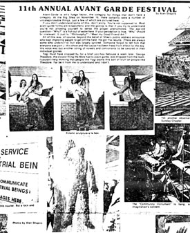 This extensive three-page article includes several photographs from the 8th Annual Avant Garde Festival, as well as vivid, personal descriptions of a number of the works.