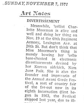 In this article, Michael Kaufman gives a biographical introduction to Charlotte Moorman, from her beginnings as a student at Juilliard to her discovery of the avant-garde via John Cage. Kaufman also describes works in the 10th Avant Garde Festival.
